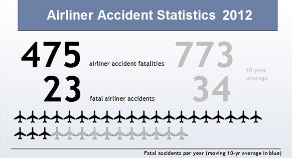 La ASN (Aviation Safety Network) dio a conocer que en 2012 hubo un total de 457 muertes por accidentes en aerolíneas, por lo que se considera un año extremadamente seguro para la aviación comparado con lo registrado en los últimos 10 años, donde el promedio rondaba las 773 muertes. En cuanto accidentes fatales en aviones de aerolíneas la cifra fue de 23, mientras que en años anteriores el promedio era de 34.